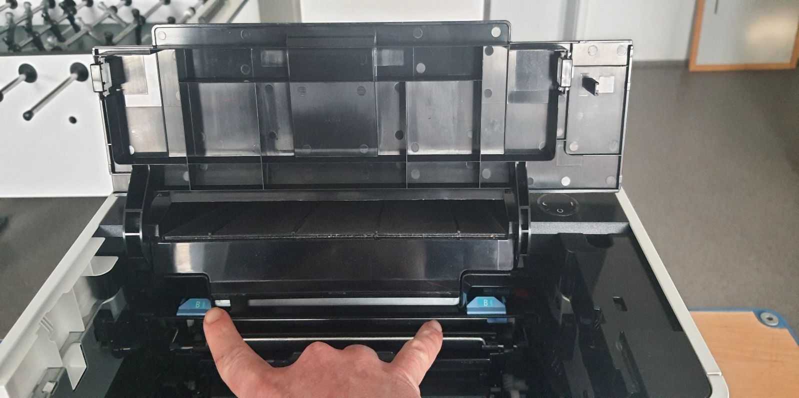 Blauen Schieber aus Arretierung 10x hin und her schieben, danach in Ausgangsposition und alles wieder zurück bauen