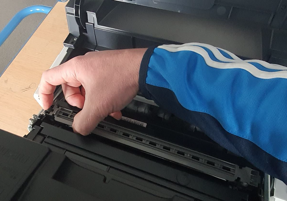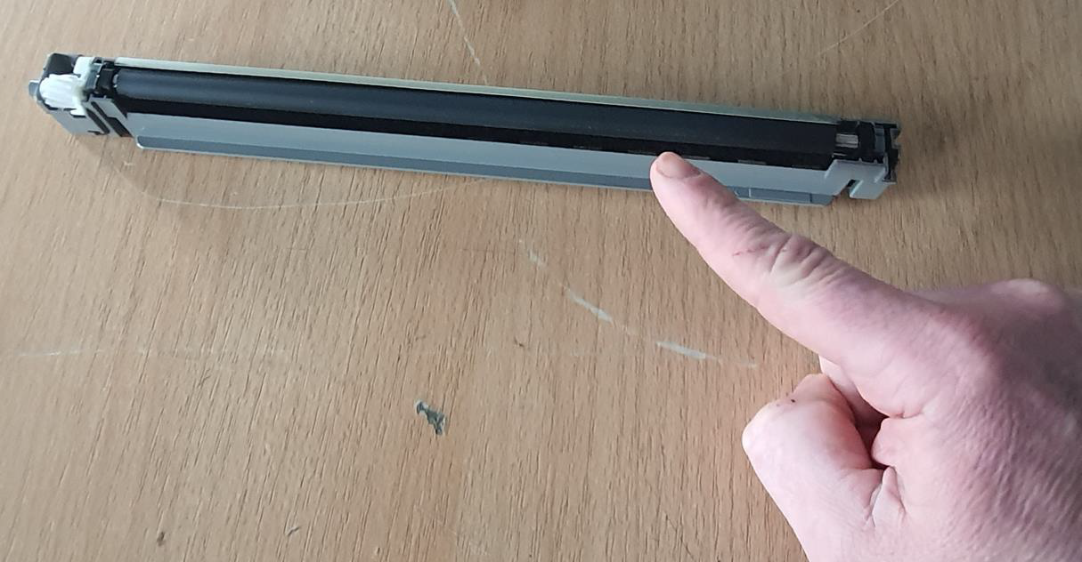 4. Die schwarze Walze mit einem Fusselfreiem Tuch und WASSER reinigen, hierbei ist darauf zu achten, dass das Tuch nur feucht ist. Anschließend die Walze TROCKEN wischen